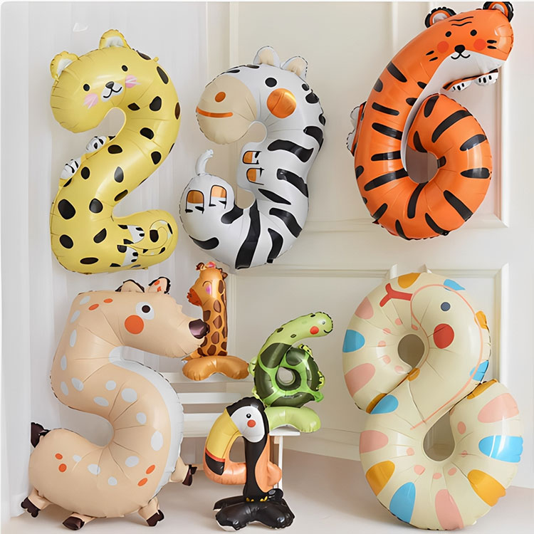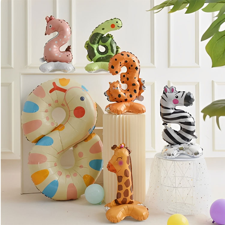 For 40 inch Animal Number Foil Balloons, each number has its own independent size because the numbers are written differently. Regarding packaging, we offer OPP bags of 50 pieces per bag, and individual cardboard packaging of 1 piece per bag. We can also pack 0-9 in one bag according to your needs, or write your logo on it; all these options are available.
