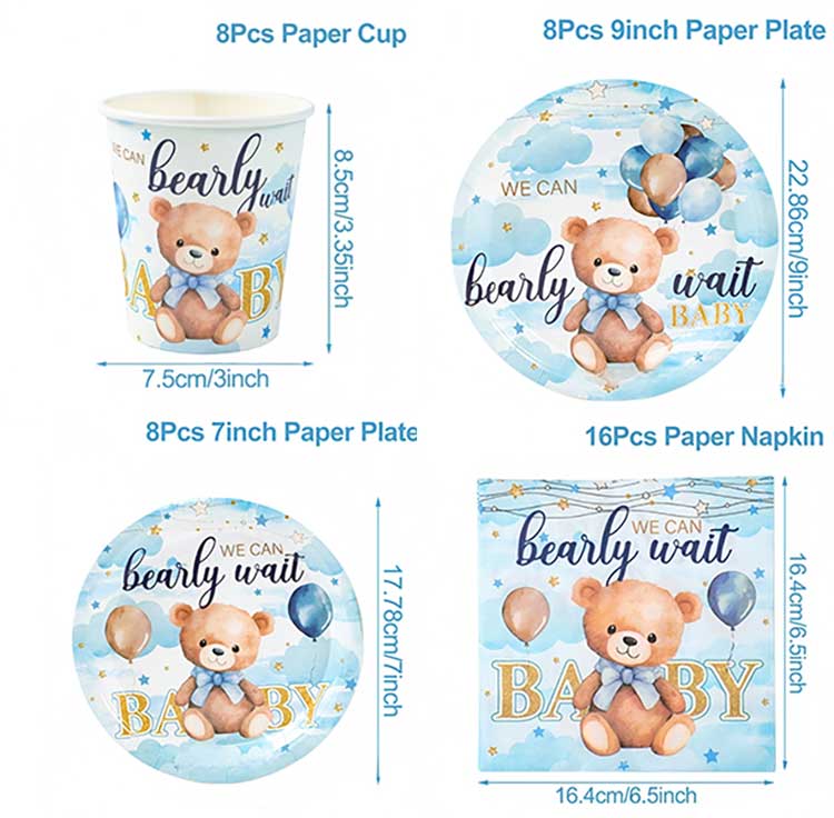 Baby birthday disposable plate set size:The product is packaged in OPP bags, but paper card packaging is also available. We can customize the packaging according to the customer's specific requirements.