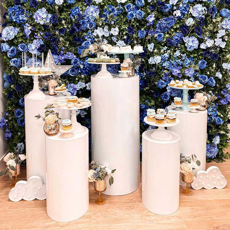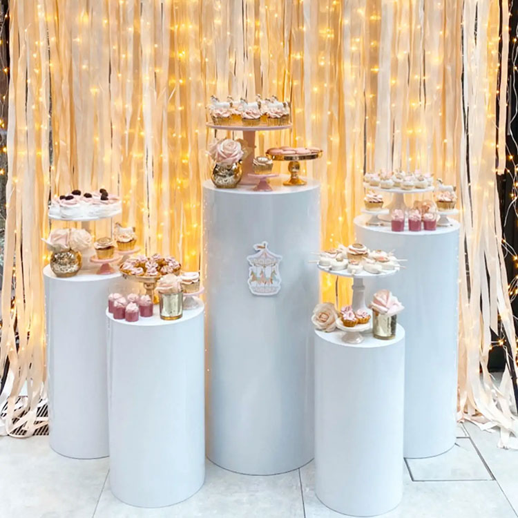 The cylindrical base dessert table serves both as a container and an ornament. Usually, they come in various combinations: 3-piece combinations, 5-piece combinations, 7-piece combinations, and so on. The most common combination is five pieces. Independent cylindrical tubes of various sizes can be flexibly arranged, and they are an important part of the scene. At the same time, we also offer customization for size and shape. What's more, they match your party decorations.