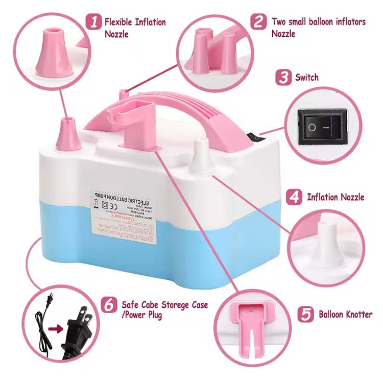 After inflating the balloon, the knotting process of the balloon is often a headache. The electric pump with knotter double nozzle cleverly solves this problem. Its built-in knotter is exquisitely designed and easy to operate. When using it, just wrap the tail of the inflated balloon around the knotter in a specific direction and gently pull it to easily tie the knot, avoiding the problems of finger pain and balloon leakage that may occur when tying the knot manually. Even if it is used for the first time,it can be quickly used, greatly improving the convenience of operation. For example, at a baby banquet, the staff used an electric pump with a knotter to quickly inflate and tie a large number of balloons, making the on-site layout efficient and smooth.
