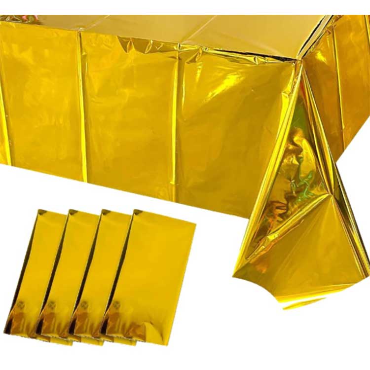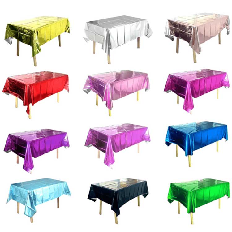 Foil Table cover is used for table setting in various celebrations. It can prevent the table surface from stains, scratches or damage, and the colors and patterns can also bring decorative effects. It is made of special PET aluminum-coated film. During the manufacturing process, we used the vacuum coating technology to ensure the strength, toughness and anti-aging performance of the table cover. Moreover, its high-density molecules can effectively prevent the penetration of soup or oil stains, and it also has a waterproof function.