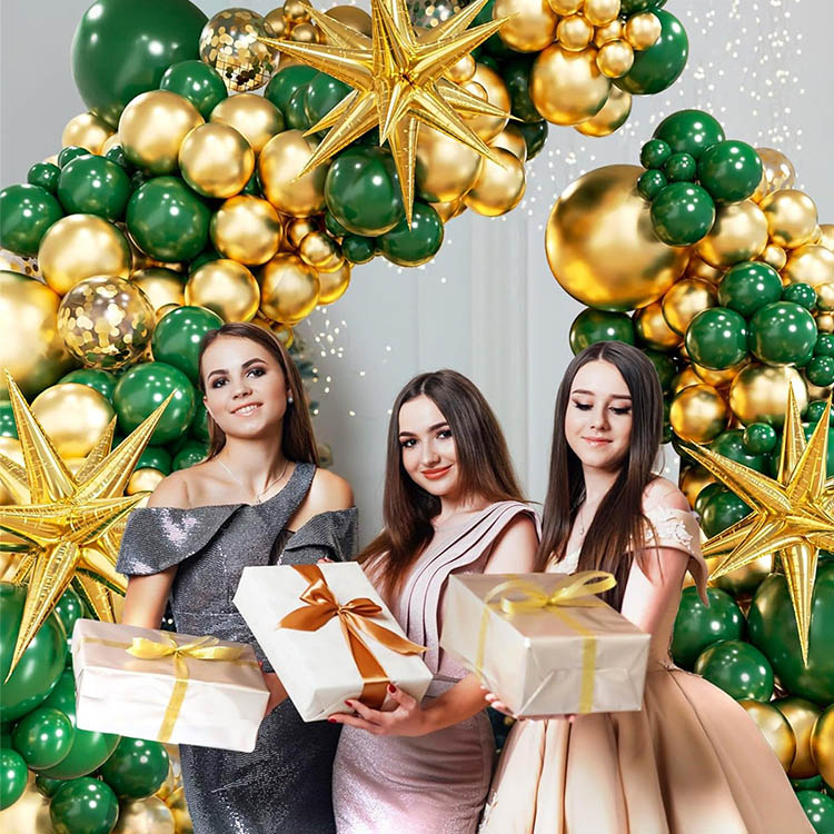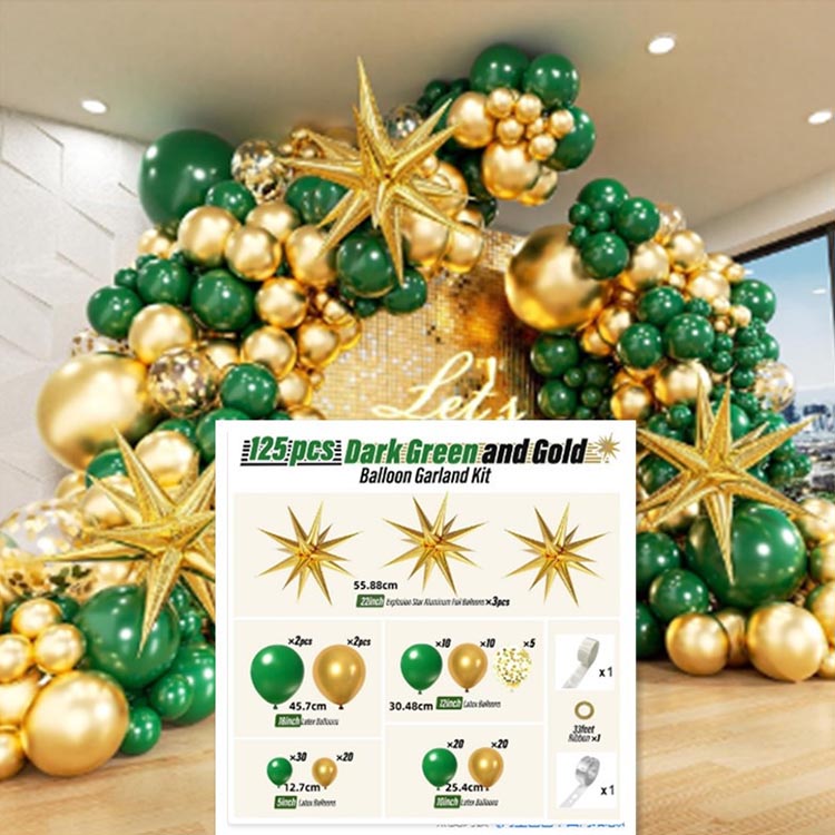 The product includes 3 sets of explosive star foil balloon. In order to make a layered effect, our gold and green balloons are designed with a combination of 5 "10" 12 "18" balloons. Forest theme Gold Star balloon arch is deeply loved by customers.