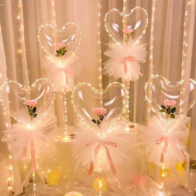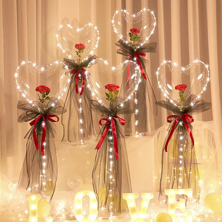 Decorative accessories:Generally,heart shaped Bobo rose sets are accompanied by some decorations,such as lace yarn,light strips,air pumps, batteries,etc. The lace can be wrapped around the bobo ball and rose, adding a flowing and romantic atmosphere to the whole; the strip can emit soft light at night or in dim conditions, making the whole outfit more dreamy and charming.