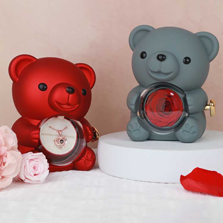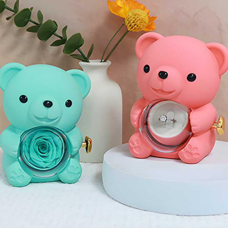 This Hug Bear Rose jewelry Box is use for display on a desk, bookshelf, or bedside table. Its most eye catching feature is the preserved rose in the center. Opening the rose reveals a compartment for storing jewelry, rings, or keepsakes.