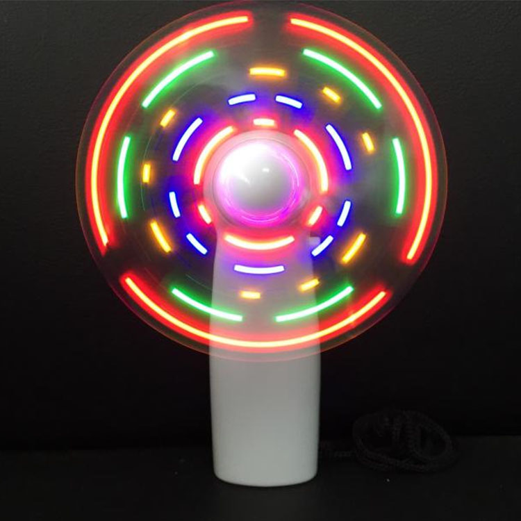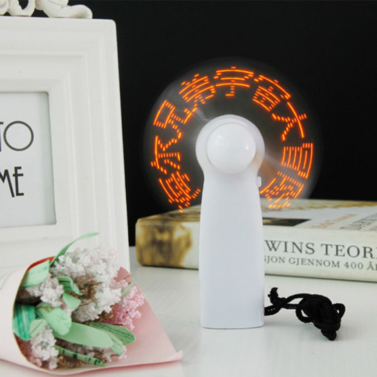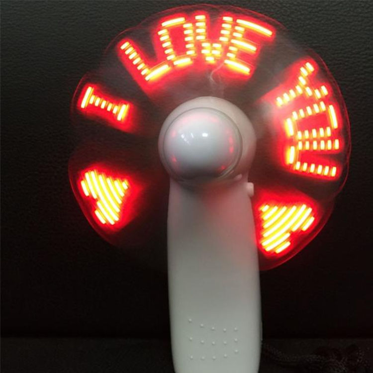 When the switch is pressed to make the LED DIY light emitting electric fan rotate, the illuminated text, LOGO and patterns specified by the customer will appear. Languages of various countries and various graphics; The lighting can be either single-color or multi-color, and both can be specified. The illuminated content is fixed before leaving the factory and cannot be changed after leaving the factory. The content will not be lost even if the power is cut off.
