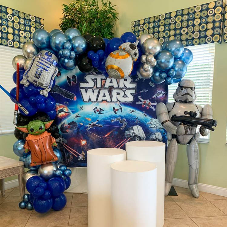 We fully consider the needs of different scenarios, providing a rich selection of specifications. Small balloons about 10-15 cm in diameter, small and delicate, suitable for decorating the centerpiece of a party table, or as a finishing touch for gift packaging, adding an interstellar style to the details. The medium size balloons are 20-30 cm in diameter and are ideal for arranging the walls and ceilings of a party. Many balloons are grouped together to form a dense array of Star Wars foil balloon elements to create an immersive party atmosphere. Large balloons, which can be up to 50cm in diameter or larger, often feature iconic characters or ships, such as the giant R2-D2 robot balloon, placed at the entrance to the event or in the background of the stage, instantly becoming the focus of attention.