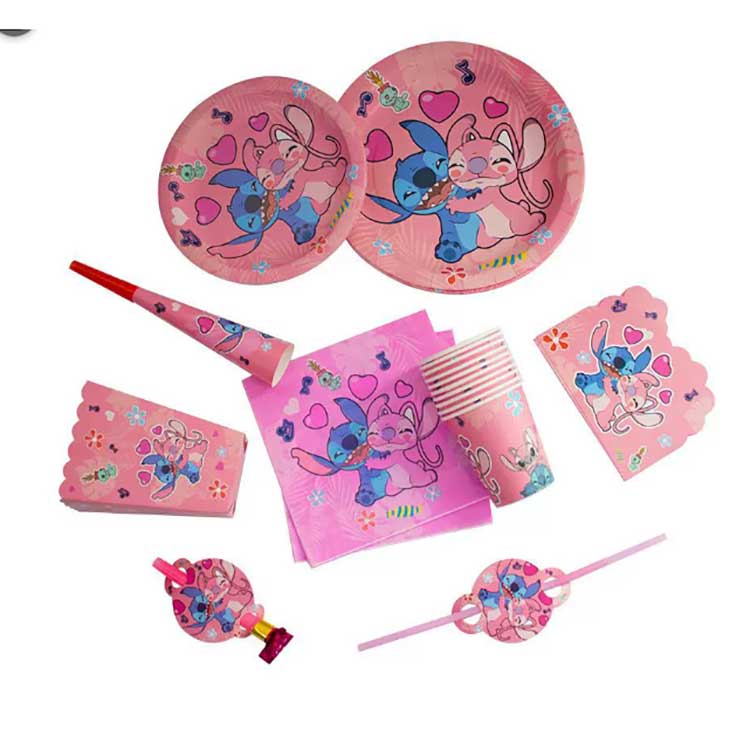 A Stitch disposable plate set includes the following products: 7-inch plates (10pcs/bag), 9-inch plates (10pcs/bag), napkins (20pcs/bag), pennants (10pcs/bag), return gift bags (10pcs/bag), popcorn boxes (6pcs/bag), blowing dragons (6pcs/bag), paper hats (6pcs/bag), paper cups (10pcs/bag), horns (6pcs/bag), straws (10pcs/bag), invitation cards (10pcs/bag), masks (10pcs/bag), spoons, cutlery (10pcs/bag), and tablecloth (1pc/bag). The set contains 17 different product types. Customers can choose to purchase the entire set or select only a portion of the items to meet their needs.