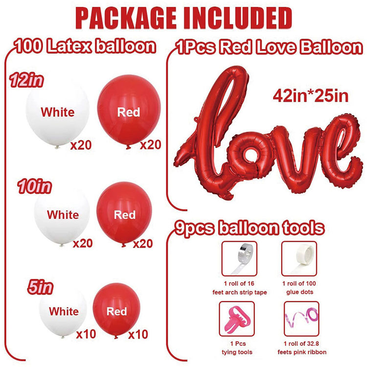 The Valentine's Day series Balloon Arch Kits are mainly designed to create a festive and cozy atmosphere during celebrations such as Valentine's Day. Such kits generally include balloons of various colors and shapes, as well as various accessories for decorating and constructing the arch.